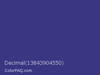 Decimal 13843904550 Color is a normal indigo color and the nearest color is Minsk #3f307f. Hex code #393682 and RGB value is rgb(57,54,130). In RGB color space, this color is composed of 22% red, 21% green, 51% blue, In CMYK color space, this color is composed of 56% cyan, 58% magenta, 0% yellow , 49% black , In HSL color space, this color has a hue angle of 242° , 41% saturation and 36% lightness.