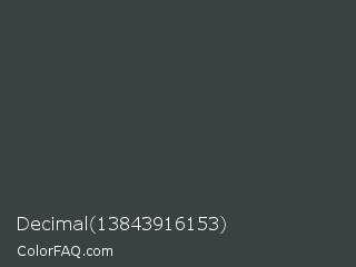 Decimal 13843916153 Color is a dark cyan color and the nearest color is Cape Cod #3c4443. Hex code #394143 and RGB value is rgb(57,65,67). In RGB color space, this color is composed of 22% red, 25% green, 26% blue, In CMYK color space, this color is composed of 15% cyan, 3% magenta, 0% yellow , 74% black , In HSL color space, this color has a hue angle of 192° , 8% saturation and 24% lightness.