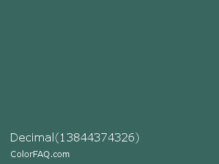 Decimal 13844374326 Color is a normal cyan color and the nearest color is William #3a686c. Hex code #396760 and RGB value is rgb(57,103,96). In RGB color space, this color is composed of 22% red, 40% green, 38% blue, In CMYK color space, this color is composed of 45% cyan, 0% magenta, 7% yellow , 60% black , In HSL color space, this color has a hue angle of 171° , 29% saturation and 31% lightness.