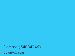 Decimal 54084246 Color is a normal blue color and the nearest color is Picton Blue #45b1e8. Hex code #33caf8 and RGB value is rgb(51,202,248). In RGB color space, this color is composed of 20% red, 79% green, 97% blue, In CMYK color space, this color is composed of 79% cyan, 19% magenta, 0% yellow , 3% black , In HSL color space, this color has a hue angle of 194° , 93% saturation and 59% lightness.