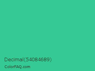 Decimal 54084689 Color is a normal green color and the nearest color is Shamrock #33cc99. Hex code #33cb93 and RGB value is rgb(51,203,147). In RGB color space, this color is composed of 20% red, 80% green, 58% blue, In CMYK color space, this color is composed of 75% cyan, 0% magenta, 28% yellow , 20% black , In HSL color space, this color has a hue angle of 158° , 60% saturation and 50% lightness.