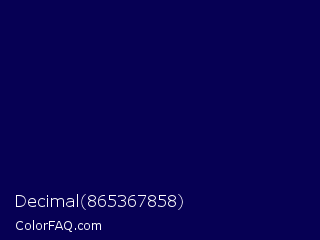 Decimal 865367858 Color is a very dark indigo color and the nearest color is Stratos #000741. Hex code #060054 and RGB value is rgb(6,0,84). In RGB color space, this color is composed of 2% red, 0% green, 33% blue, In CMYK color space, this color is composed of 93% cyan, 100% magenta, 0% yellow , 67% black , In HSL color space, this color has a hue angle of 244° , 100% saturation and 16% lightness.