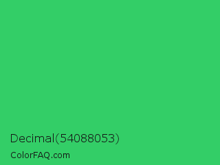 Decimal 54088053 Color is a normal green color and the nearest color is UFO Green #3cd070. Hex code #33ce67 and RGB value is rgb(51,206,103). In RGB color space, this color is composed of 20% red, 81% green, 40% blue, In CMYK color space, this color is composed of 75% cyan, 0% magenta, 50% yellow , 19% black , In HSL color space, this color has a hue angle of 140° , 61% saturation and 50% lightness.