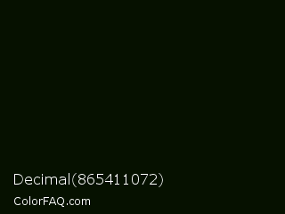 Decimal 865411072 Color is a almost black green color and the nearest color is Midnight Moss #041004. Hex code #061100 and RGB value is rgb(6,17,0). In RGB color space, this color is composed of 2% red, 7% green, 0% blue, In CMYK color space, this color is composed of 65% cyan, 0% magenta, 100% yellow , 93% black , In HSL color space, this color has a hue angle of 99° , 100% saturation and 3% lightness.