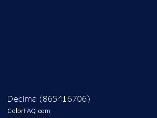 Decimal 865416706 Color is a very dark blue color and the nearest color is Tangaroa #03163c. Hex code #061742 and RGB value is rgb(6,23,66). In RGB color space, this color is composed of 2% red, 9% green, 26% blue, In CMYK color space, this color is composed of 91% cyan, 65% magenta, 0% yellow , 74% black , In HSL color space, this color has a hue angle of 223° , 83% saturation and 14% lightness.