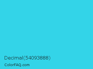 Decimal 54093888 Color is a normal cyan color and the nearest color is Scooter #2ebfd4. Hex code #33d4e8 and RGB value is rgb(51,212,232). In RGB color space, this color is composed of 20% red, 83% green, 91% blue, In CMYK color space, this color is composed of 78% cyan, 9% magenta, 0% yellow , 9% black , In HSL color space, this color has a hue angle of 187° , 80% saturation and 55% lightness.