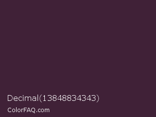 Decimal 13848834343 Color is a very dark magenta color and the nearest color is Blackcurrant #32293a. Hex code #402137 and RGB value is rgb(64,33,55). In RGB color space, this color is composed of 25% red, 13% green, 22% blue, In CMYK color space, this color is composed of 0% cyan, 48% magenta, 14% yellow , 75% black , In HSL color space, this color has a hue angle of 317° , 32% saturation and 19% lightness.