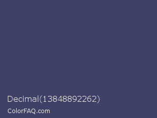 Decimal 13848892262 Color is a normal blue color and the nearest color is Gun Powder #414257. Hex code #404166 and RGB value is rgb(64,65,102). In RGB color space, this color is composed of 25% red, 25% green, 40% blue, In CMYK color space, this color is composed of 37% cyan, 36% magenta, 0% yellow , 60% black , In HSL color space, this color has a hue angle of 238° , 23% saturation and 33% lightness.