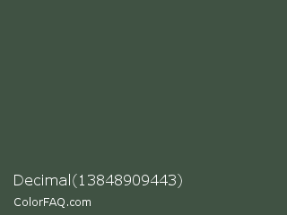 Decimal 13848909443 Color is a dark green color and the nearest color is Gray Asparagus #465945. Hex code #405243 and RGB value is rgb(64,82,67). In RGB color space, this color is composed of 25% red, 32% green, 26% blue, In CMYK color space, this color is composed of 22% cyan, 0% magenta, 18% yellow , 68% black , In HSL color space, this color has a hue angle of 130° , 12% saturation and 29% lightness.