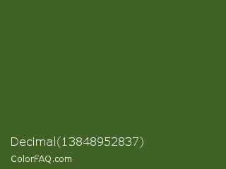 Decimal 13848952837 Color is a dark green color and the nearest color is Dark Moss Green #4a5d23. Hex code #406325 and RGB value is rgb(64,99,37). In RGB color space, this color is composed of 25% red, 39% green, 15% blue, In CMYK color space, this color is composed of 35% cyan, 0% magenta, 63% yellow , 61% black , In HSL color space, this color has a hue angle of 94° , 46% saturation and 27% lightness.