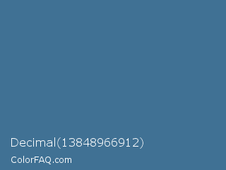 Decimal 13848966912 Color is a normal blue color and the nearest color is Queen Blue #436b95. Hex code #407194 and RGB value is rgb(64,113,148). In RGB color space, this color is composed of 25% red, 44% green, 58% blue, In CMYK color space, this color is composed of 57% cyan, 24% magenta, 0% yellow , 42% black , In HSL color space, this color has a hue angle of 205° , 40% saturation and 42% lightness.