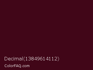 Decimal 13849614112 Color is a very dark rose color and the nearest color is Aubergine #3b0910. Hex code #410618 and RGB value is rgb(65,6,24). In RGB color space, this color is composed of 25% red, 2% green, 9% blue, In CMYK color space, this color is composed of 0% cyan, 91% magenta, 63% yellow , 75% black , In HSL color space, this color has a hue angle of 342° , 83% saturation and 14% lightness.