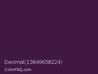 Decimal 13849658224 Color is a very dark magenta color and the nearest color is Loulou #460b41. Hex code #411842 and RGB value is rgb(65,24,66). In RGB color space, this color is composed of 25% red, 9% green, 26% blue, In CMYK color space, this color is composed of 2% cyan, 64% magenta, 0% yellow , 74% black , In HSL color space, this color has a hue angle of 299° , 47% saturation and 18% lightness.