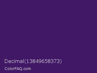 Decimal 13849658373 Color is a dark purple color and the nearest color is Scarlet Gum #431560. Hex code #411865 and RGB value is rgb(65,24,101). In RGB color space, this color is composed of 25% red, 9% green, 40% blue, In CMYK color space, this color is composed of 36% cyan, 76% magenta, 0% yellow , 60% black , In HSL color space, this color has a hue angle of 272° , 62% saturation and 25% lightness.