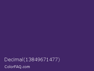 Decimal 13849671477 Color is a dark violet color and the nearest color is Jacarta #3a2a6a. Hex code #412567 and RGB value is rgb(65,37,103). In RGB color space, this color is composed of 25% red, 15% green, 40% blue, In CMYK color space, this color is composed of 37% cyan, 64% magenta, 0% yellow , 60% black , In HSL color space, this color has a hue angle of 265° , 47% saturation and 27% lightness.