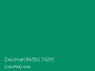 Decimal 865617429 Color is a dark green color and the nearest color is Green Cyan #009966. Hex code #069067 and RGB value is rgb(6,144,103). In RGB color space, this color is composed of 2% red, 56% green, 40% blue, In CMYK color space, this color is composed of 96% cyan, 0% magenta, 28% yellow , 44% black , In HSL color space, this color has a hue angle of 162° , 92% saturation and 29% lightness.