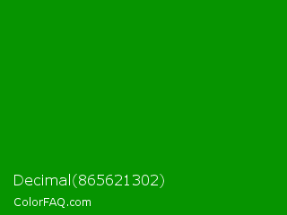 Decimal 865621302 Color is a dark green color and the nearest color is Islamic Green #009000. Hex code #069400 and RGB value is rgb(6,148,0). In RGB color space, this color is composed of 2% red, 58% green, 0% blue, In CMYK color space, this color is composed of 96% cyan, 0% magenta, 100% yellow , 42% black , In HSL color space, this color has a hue angle of 118° , 100% saturation and 29% lightness.