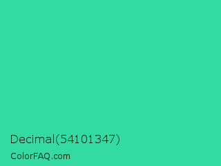 Decimal 54101347 Color is a normal green color and the nearest color is Shamrock #33cc99. Hex code #33dba3 and RGB value is rgb(51,219,163). In RGB color space, this color is composed of 20% red, 86% green, 64% blue, In CMYK color space, this color is composed of 77% cyan, 0% magenta, 26% yellow , 14% black , In HSL color space, this color has a hue angle of 160° , 70% saturation and 53% lightness.