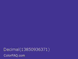 Decimal 13850936371 Color is a normal indigo color and the nearest color is Dark Slate Blue #483d8b. Hex code #433391 and RGB value is rgb(67,51,145). In RGB color space, this color is composed of 26% red, 20% green, 57% blue, In CMYK color space, this color is composed of 54% cyan, 65% magenta, 0% yellow , 43% black , In HSL color space, this color has a hue angle of 250° , 48% saturation and 38% lightness.