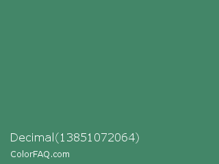 Decimal 13851072064 Color is a normal green color and the nearest color is Viridian #40826d. Hex code #438668 and RGB value is rgb(67,134,104). In RGB color space, this color is composed of 26% red, 53% green, 41% blue, In CMYK color space, this color is composed of 50% cyan, 0% magenta, 22% yellow , 47% black , In HSL color space, this color has a hue angle of 153° , 33% saturation and 39% lightness.