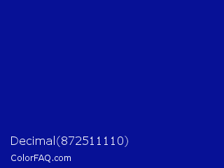 Decimal 872511110 Color is a normal blue color and the nearest color is Indigo Dye #091f92. Hex code #071196 and RGB value is rgb(7,17,150). In RGB color space, this color is composed of 3% red, 7% green, 59% blue, In CMYK color space, this color is composed of 95% cyan, 89% magenta, 0% yellow , 41% black , In HSL color space, this color has a hue angle of 236° , 91% saturation and 31% lightness.