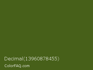 Decimal 13960878455 Color is a dark green color and the nearest color is Dark Moss Green #4a5d23. Hex code #476019 and RGB value is rgb(71,96,25). In RGB color space, this color is composed of 28% red, 38% green, 10% blue, In CMYK color space, this color is composed of 26% cyan, 0% magenta, 74% yellow , 62% black , In HSL color space, this color has a hue angle of 81° , 59% saturation and 24% lightness.