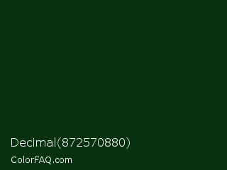 Decimal 872570880 Color is a very dark green color and the nearest color is English Holly #022d15. Hex code #073210 and RGB value is rgb(7,50,16). In RGB color space, this color is composed of 3% red, 20% green, 6% blue, In CMYK color space, this color is composed of 86% cyan, 0% magenta, 68% yellow , 80% black , In HSL color space, this color has a hue angle of 133° , 75% saturation and 11% lightness.