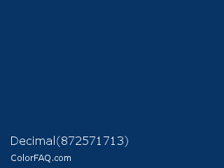 Decimal 872571713 Color is a very dark blue color and the nearest color is Midnight Blue #003366. Hex code #073365 and RGB value is rgb(7,51,101). In RGB color space, this color is composed of 3% red, 20% green, 40% blue, In CMYK color space, this color is composed of 93% cyan, 50% magenta, 0% yellow , 60% black , In HSL color space, this color has a hue angle of 212° , 87% saturation and 21% lightness.