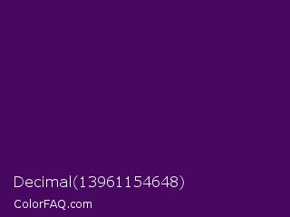 Decimal 13961154648 Color is a very dark purple color and the nearest color is Clairvoyant #480656. Hex code #480862 and RGB value is rgb(72,8,98). In RGB color space, this color is composed of 28% red, 3% green, 38% blue, In CMYK color space, this color is composed of 27% cyan, 92% magenta, 0% yellow , 62% black , In HSL color space, this color has a hue angle of 283° , 85% saturation and 21% lightness.
