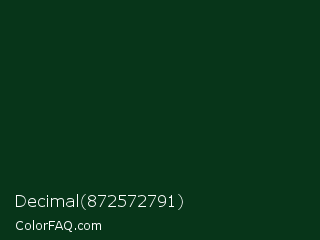 Decimal 872572791 Color is a very dark green color and the nearest color is County Green #01371a. Hex code #073519 and RGB value is rgb(7,53,25). In RGB color space, this color is composed of 3% red, 21% green, 10% blue, In CMYK color space, this color is composed of 87% cyan, 0% magenta, 53% yellow , 79% black , In HSL color space, this color has a hue angle of 143° , 77% saturation and 12% lightness.