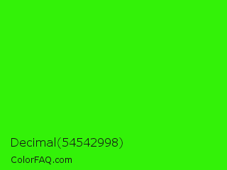 Decimal 54542998 Color is a normal green color and the nearest color is Neon Green #39ff14. Hex code #33f208 and RGB value is rgb(51,242,8). In RGB color space, this color is composed of 20% red, 95% green, 3% blue, In CMYK color space, this color is composed of 79% cyan, 0% magenta, 97% yellow , 5% black , In HSL color space, this color has a hue angle of 109° , 94% saturation and 49% lightness.