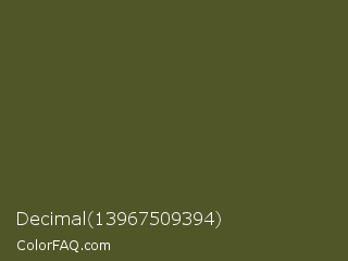 Decimal 13967509394 Color is a dark yellow color and the nearest color is Woodland #4d5328. Hex code #515628 and RGB value is rgb(81,86,40). In RGB color space, this color is composed of 32% red, 34% green, 16% blue, In CMYK color space, this color is composed of 6% cyan, 0% magenta, 53% yellow , 66% black , In HSL color space, this color has a hue angle of 67° , 37% saturation and 25% lightness.