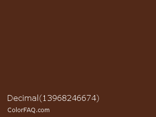 Decimal 13968246674 Color is a very dark orange color and the nearest color is Brown Derby #492615. Hex code #522918 and RGB value is rgb(82,41,24). In RGB color space, this color is composed of 32% red, 16% green, 9% blue, In CMYK color space, this color is composed of 0% cyan, 50% magenta, 71% yellow , 68% black , In HSL color space, this color has a hue angle of 18° , 55% saturation and 21% lightness.