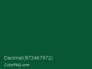 Decimal 873467972 Color is a very dark green color and the nearest color is Sacramento State Green #00563f. Hex code #085734 and RGB value is rgb(8,87,52). In RGB color space, this color is composed of 3% red, 34% green, 20% blue, In CMYK color space, this color is composed of 91% cyan, 0% magenta, 40% yellow , 66% black , In HSL color space, this color has a hue angle of 153° , 83% saturation and 19% lightness.