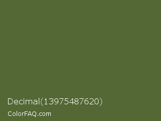 Decimal 13975487620 Color is a normal green color and the nearest color is Dark Olive Green #556b2f. Hex code #536834 and RGB value is rgb(83,104,52). In RGB color space, this color is composed of 33% red, 41% green, 20% blue, In CMYK color space, this color is composed of 20% cyan, 0% magenta, 50% yellow , 59% black , In HSL color space, this color has a hue angle of 84° , 33% saturation and 31% lightness.