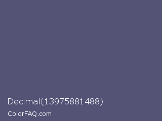 Decimal 13975881488 Color is a normal indigo color and the nearest color is Purple Navy #4e5180. Hex code #545376 and RGB value is rgb(84,83,118). In RGB color space, this color is composed of 33% red, 33% green, 46% blue, In CMYK color space, this color is composed of 29% cyan, 30% magenta, 0% yellow , 54% black , In HSL color space, this color has a hue angle of 242° , 17% saturation and 39% lightness.
