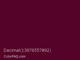 Decimal 13976557892 Color is a very dark rose color and the nearest color is Castro #52001f. Hex code #550428 and RGB value is rgb(85,4,40). In RGB color space, this color is composed of 33% red, 2% green, 16% blue, In CMYK color space, this color is composed of 0% cyan, 95% magenta, 53% yellow , 67% black , In HSL color space, this color has a hue angle of 333° , 91% saturation and 17% lightness.