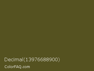 Decimal 13976688900 Color is a dark yellow color and the nearest color is Army Green #4b5320. Hex code #555220 and RGB value is rgb(85,82,32). In RGB color space, this color is composed of 33% red, 32% green, 13% blue, In CMYK color space, this color is composed of 0% cyan, 4% magenta, 62% yellow , 67% black , In HSL color space, this color has a hue angle of 57° , 45% saturation and 23% lightness.