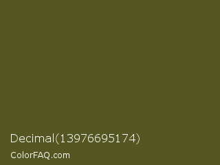 Decimal 13976695174 Color is a dark yellow color and the nearest color is Woodland #4d5328. Hex code #555722 and RGB value is rgb(85,87,34). In RGB color space, this color is composed of 33% red, 34% green, 13% blue, In CMYK color space, this color is composed of 2% cyan, 0% magenta, 61% yellow , 66% black , In HSL color space, this color has a hue angle of 62° , 44% saturation and 24% lightness.