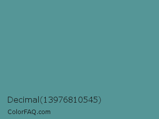 Decimal 13976810545 Color is a normal cyan color and the nearest color is Cadet Blue #5f9ea0. Hex code #559697 and RGB value is rgb(85,150,151). In RGB color space, this color is composed of 33% red, 59% green, 59% blue, In CMYK color space, this color is composed of 44% cyan, 1% magenta, 0% yellow , 41% black , In HSL color space, this color has a hue angle of 181° , 28% saturation and 46% lightness.