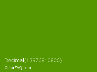 Decimal 13976810806 Color is a dark green color and the nearest color is Avocado #568203. Hex code #559700 and RGB value is rgb(85,151,0). In RGB color space, this color is composed of 33% red, 59% green, 0% blue, In CMYK color space, this color is composed of 44% cyan, 0% magenta, 100% yellow , 41% black , In HSL color space, this color has a hue angle of 86° , 100% saturation and 30% lightness.