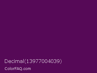 Decimal 13977004039 Color is a very dark magenta color and the nearest color is Clairvoyant #480656. Hex code #560957 and RGB value is rgb(86,9,87). In RGB color space, this color is composed of 34% red, 4% green, 34% blue, In CMYK color space, this color is composed of 1% cyan, 90% magenta, 0% yellow , 66% black , In HSL color space, this color has a hue angle of 299° , 81% saturation and 19% lightness.