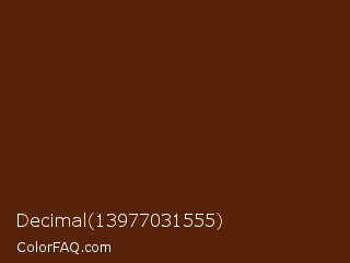 Decimal 13977031555 Color is a very dark orange color and the nearest color is Seal Brown #59260b. Hex code #562307 and RGB value is rgb(86,35,7). In RGB color space, this color is composed of 34% red, 14% green, 3% blue, In CMYK color space, this color is composed of 0% cyan, 59% magenta, 92% yellow , 66% black , In HSL color space, this color has a hue angle of 21° , 85% saturation and 18% lightness.