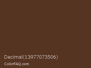 Decimal 13977073506 Color is a dark orange color and the nearest color is Saddle #4c3024. Hex code #563422 and RGB value is rgb(86,52,34). In RGB color space, this color is composed of 34% red, 20% green, 13% blue, In CMYK color space, this color is composed of 0% cyan, 40% magenta, 60% yellow , 66% black , In HSL color space, this color has a hue angle of 21° , 43% saturation and 24% lightness.