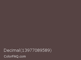Decimal 13977089589 Color is a dark red color and the nearest color is Emperor #514649. Hex code #564343 and RGB value is rgb(86,67,67). In RGB color space, this color is composed of 34% red, 26% green, 26% blue, In CMYK color space, this color is composed of 0% cyan, 22% magenta, 22% yellow , 66% black , In HSL color space, this color has a hue angle of 0° , 12% saturation and 30% lightness.