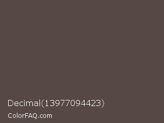 Decimal 13977094423 Color is a dark red color and the nearest color is Emperor #514649. Hex code #564845 and RGB value is rgb(86,72,69). In RGB color space, this color is composed of 34% red, 28% green, 27% blue, In CMYK color space, this color is composed of 0% cyan, 16% magenta, 20% yellow , 66% black , In HSL color space, this color has a hue angle of 11° , 11% saturation and 30% lightness.
