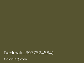Decimal 13977524584 Color is a dark yellow color and the nearest color is Woodland #4d5328. Hex code #565430 and RGB value is rgb(86,84,48). In RGB color space, this color is composed of 34% red, 33% green, 19% blue, In CMYK color space, this color is composed of 0% cyan, 2% magenta, 44% yellow , 66% black , In HSL color space, this color has a hue angle of 57° , 28% saturation and 26% lightness.
