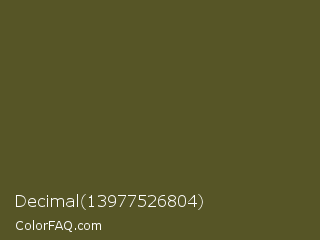 Decimal 13977526804 Color is a dark yellow color and the nearest color is Woodland #4d5328. Hex code #565526 and RGB value is rgb(86,85,38). In RGB color space, this color is composed of 34% red, 33% green, 15% blue, In CMYK color space, this color is composed of 0% cyan, 1% magenta, 56% yellow , 66% black , In HSL color space, this color has a hue angle of 59° , 39% saturation and 24% lightness.
