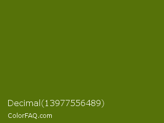 Decimal 13977556489 Color is a dark lime color and the nearest color is Avocado #568203. Hex code #567209 and RGB value is rgb(86,114,9). In RGB color space, this color is composed of 34% red, 45% green, 4% blue, In CMYK color space, this color is composed of 25% cyan, 0% magenta, 92% yellow , 55% black , In HSL color space, this color has a hue angle of 76° , 85% saturation and 24% lightness.