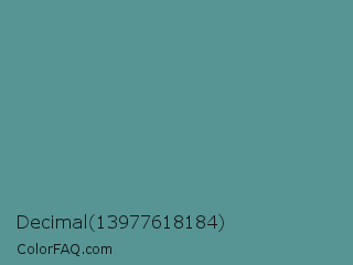 Decimal 13977618184 Color is a normal cyan color and the nearest color is Patina #639a8f. Hex code #569594 and RGB value is rgb(86,149,148). In RGB color space, this color is composed of 34% red, 58% green, 58% blue, In CMYK color space, this color is composed of 42% cyan, 0% magenta, 1% yellow , 42% black , In HSL color space, this color has a hue angle of 179° , 27% saturation and 46% lightness.